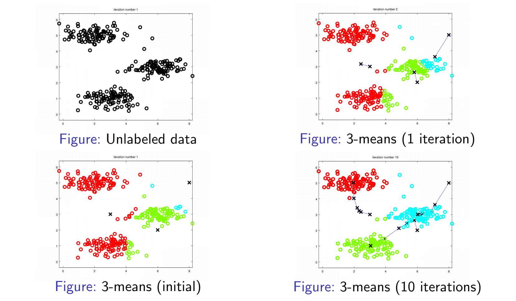 대표적인 군집화 모델 중 하나인 K-means의 학습과정을 시각화한 것이다. 비지도 학습은 라벨이 표시되지 않은 데이터셋를 사용하여 모델을 학습시킨다(즉, 제공된 데이터셋에 대해 참값을 알 수 없음). 즉, 학습 알고리즘은 주어진 데이터셋이 무엇을 나타내는지 사전에 알지 못한다. 위의 표에서 비지도 학습에서는 입력 데이터 $x$만을 알고 있으며, 그에 대응하는 참값 $y$을 알 수 없다. 입력 데이터만을 통해 최적의 파라미터 $\theta$를 찾는 것이 목표라고 할 수 있다. 비지도 학습이 활용되는 대표적인 문제로 군집화 문제(Clustering)과 차원 축소 문제(Dimensionality reduction)가 있다.