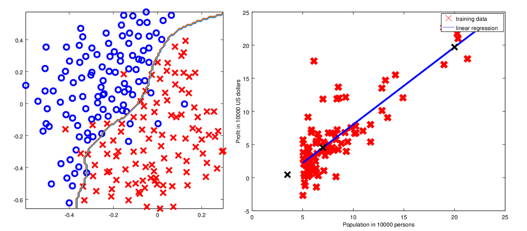 비선형 분류 모델(좌)과 선형 회귀 모델(우)의 학습 결과를 시각화한 것이다. 지도 학습은 데이터셋과 함께 참값(예: 결과 또는 라벨)을 사용하여 모델을 학습시킨다. 데이터셋과 참값을 통해 학습된 후에는, 학습 이전에 보지 못했던 새로운 데이터에 대한 답을 찾을 수 있어야 한다. 학습 알고리즘은 그러한 결과를 얻기 위해 과거의 경험을 이용한다. 위의 표에서 지도 학습에서는 입력 데이터 $x$와 그에 대응하는 참값 $y$를 알고 있으며, 이를 통해 최적의 파라미터 $\theta$를 찾는 것이 목표라고 할 수 있다. 지도 학습이 활용되는 대표적인 문제로 분류 문제(Classification)과 회귀 문제(Regression)가 있다.