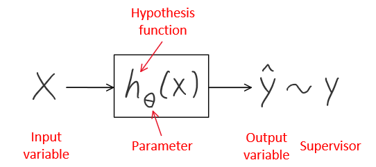 이 그림은 일반적인 기계학습 모델을 시스템의 관점에서 표현한 그림이다. 먼저 위의 그림에서 등장하는 기호들의 의미에 대해서 알아보자. 모든 기계학습 모델은 입력되는 데이터 $x$에 대해서 출력값 $\hat{y}$을 가지는 함수로 볼 수 있다. 이 함수를 가설 함수(hypothesis function)이라고 한다. 가설 함수 $h$는 파라미터 $\theta$를 가지고 있으며, 파라미터의 값에 따라 가설 함수의 출력 $\hat{y}$이 달라진다. 이 출력값 $\hat{y}$은 모델의 예측값(predict)라고도 불린다. Supervisor $y$는 입력 데이터 $x$에 대응되는, 모델이 예측하기를 기대하는 참값이다. 결국 모델을 학습시킨다는 것은 예측값 $\hat{y}$이 참값 $y$에 비슷해지도록 $\theta$를 조절해나가는 것이며, 이것이 기계학습의 전부이다.