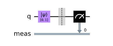 큐비트 $q$의 양자 상태를 측정하는 양자 회로 중첩 상태는 측정을 하는 순간 확률에 따라 측정에 사용한 기저 상태 중 하나로 붕괴됩니다.