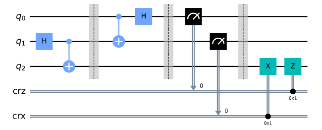 양자 전송(Quantum teleportation) 알고리즘의 회로 - 실행 후 $q_0$의 상태가 $q_2$로 전송된다. 앞으로 배우게될 양자 알고리즘들은 위와 같이 양자 회로로 표현됩니다.