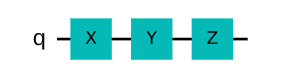 파울리 X, Y, Z 게이트를 연달아 적용한 양자 회로 파울리 게이트는 총 세가지로, x, y, z 총 세가지 종류가 있습니다.