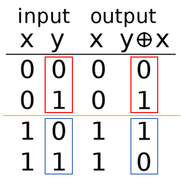 XOR 게이트는 $x=1$일 때 $y$에 대한 NOT 게이트과 같이 동작한다. 실제로 논리 회로나 컴퓨터 구조 등의 과목에서 다루는 내용인데,