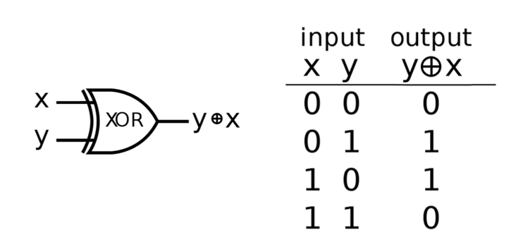 XOR 게이트의 회로 기호와 진리표 XOR 게이트는 위와 같이 두 비트의 입력을 받아 한 비트의 결과를 반환합니다.
