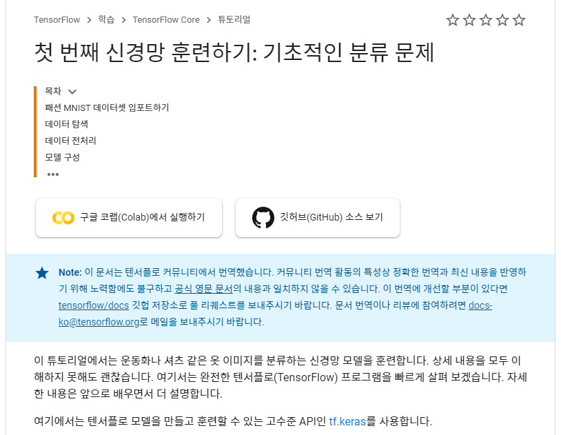 Tensorflow 공식 페이지의 튜토리얼. 모든 문서에서 '구글 코랩에서 실행하기'를 클릭하여 직접 코드를 실행시켜볼 수 있다. 컴퓨터 사양이나 개발환경은 문제가 되지 않을 것이다. 처음에 소개한 구글의 Colaboratory는 로컬PC의 하드웨어 성능과는 관계없이 구글 클라우드 서버의 GPU, TPU등의 하드웨어 자원을 무료로 활용할 수 있다. 준비물은 인터넷과 웹브라우저, 그리고 구글 계정 뿐이다. 또한 앞에서 추천한 Tensorflow2.0의 튜토리얼의 모든 코드는 한두번의 클릭만으로 Colaboratory로 옮겨와서 직접 실행해볼 수 있도록 만들어져있다.